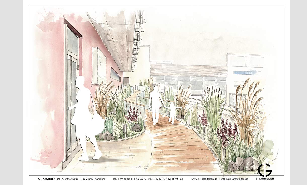 Die Sanierung wurde genutzt, um den Außenbereich völlig neu zu gestalten inklusive einer neuen geschwungenen Rampenanlage aus Stahl mit Ganzglasgeländern.